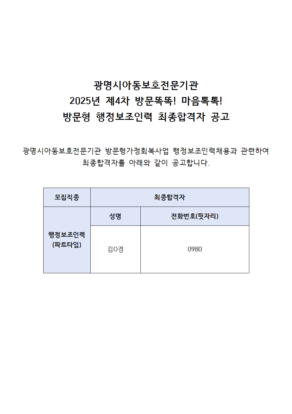 2025년 '방문 똑똑! 마음 톡톡! 방문형 가정회복사업' 제4차 행정보조인력(파트타임) 최종 합격자 공고