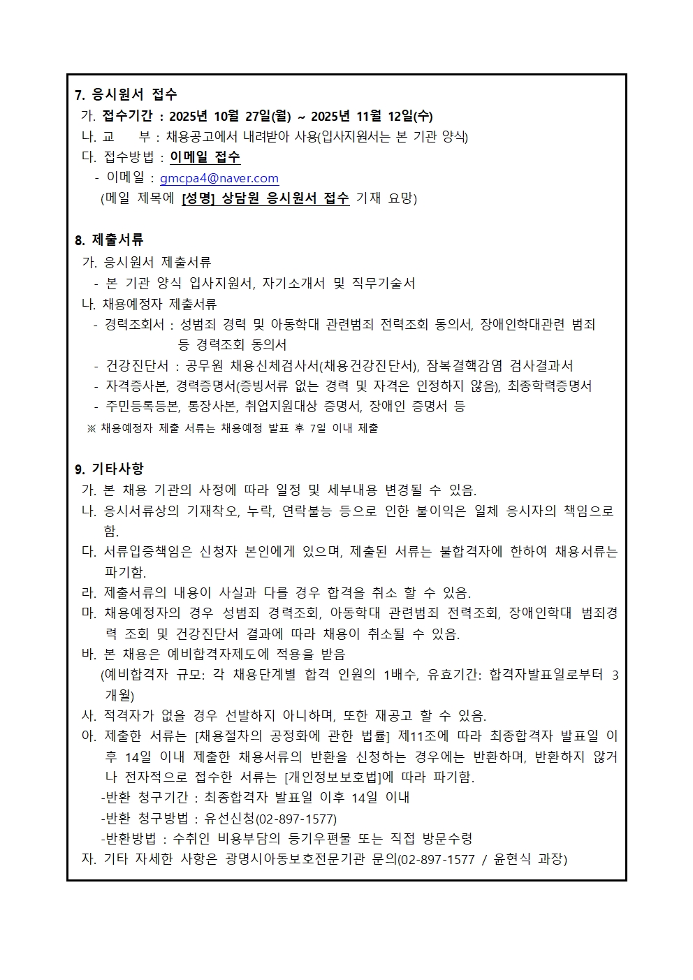 [채용] 광명시아동보호전문기관 2025년 제5차 직원채용(기간제계약직) 공고(상담원)