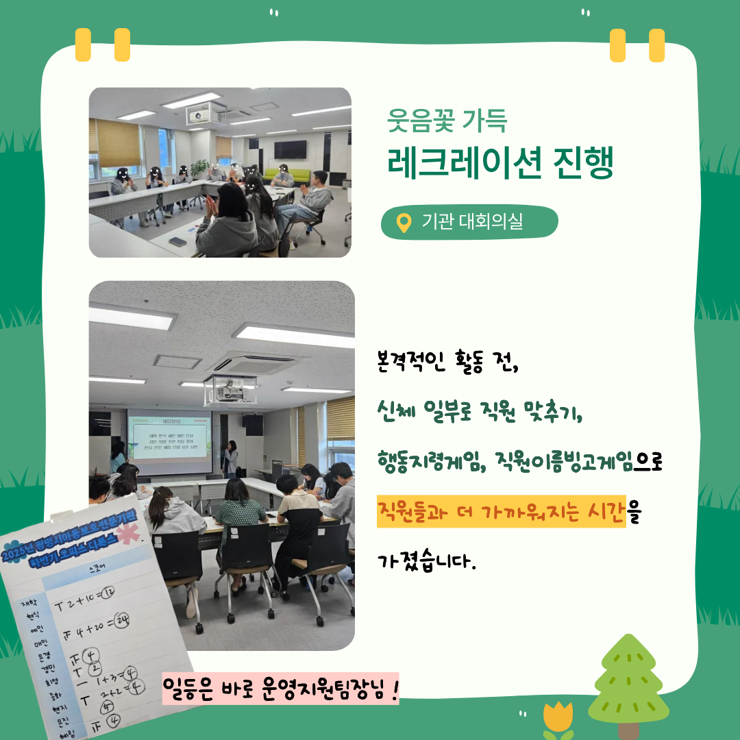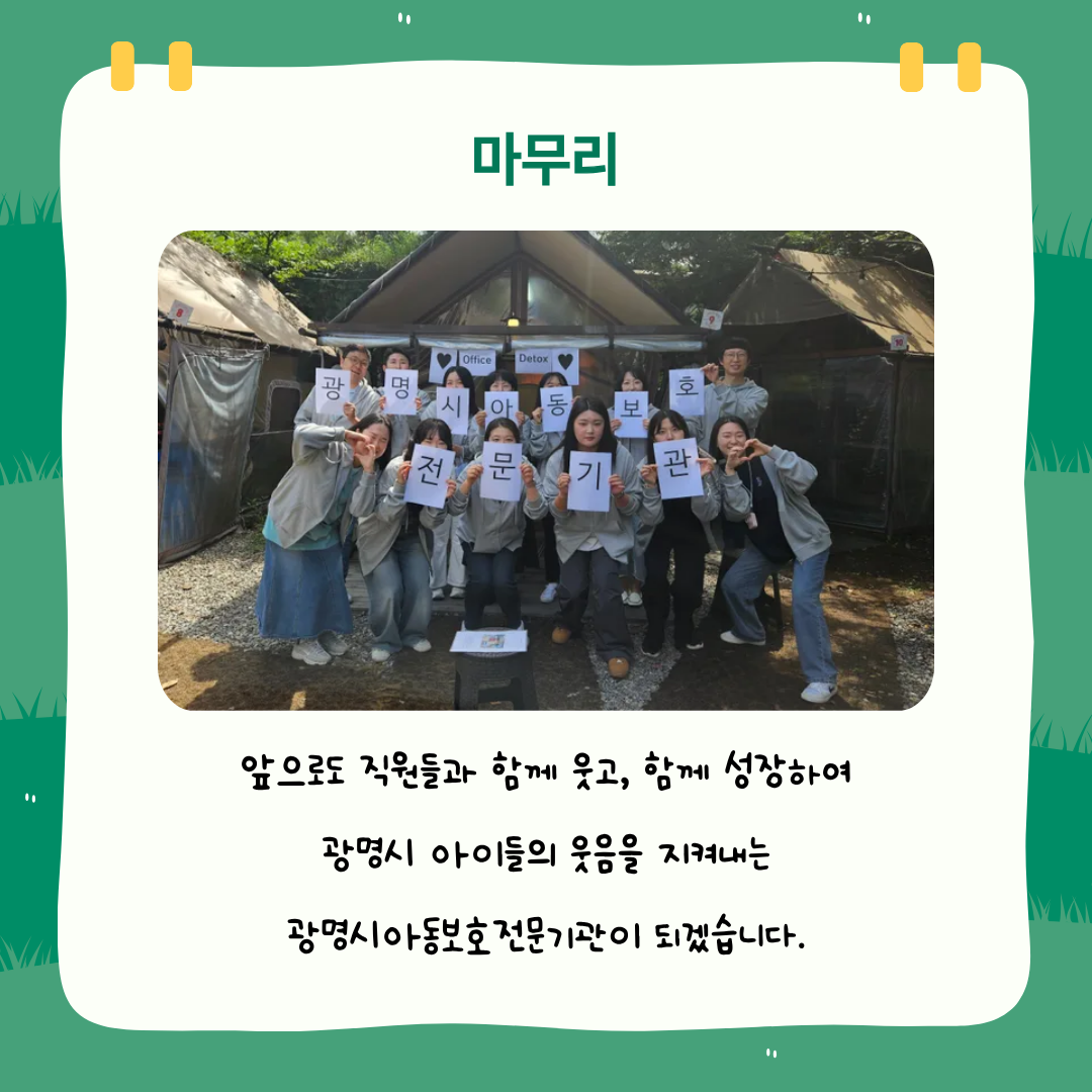 앞으로도 광명시아동보호전문기관은 직원 한 사람 한 사람이 행복하게 일할 수 있는 건강한 근무환경을 만들어가며, 그 에너지가 아동과 지역사회로 확산될 수 있도록 노력하겠습니다.