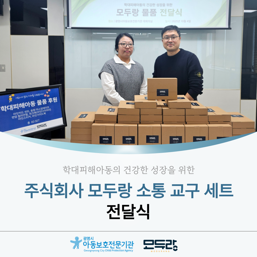 광명시아동보호전문기관은 주식회사 모두랑과 함께 학대 피해아동가정을 위한 소통교구세트 전달식을 진행했습니다.